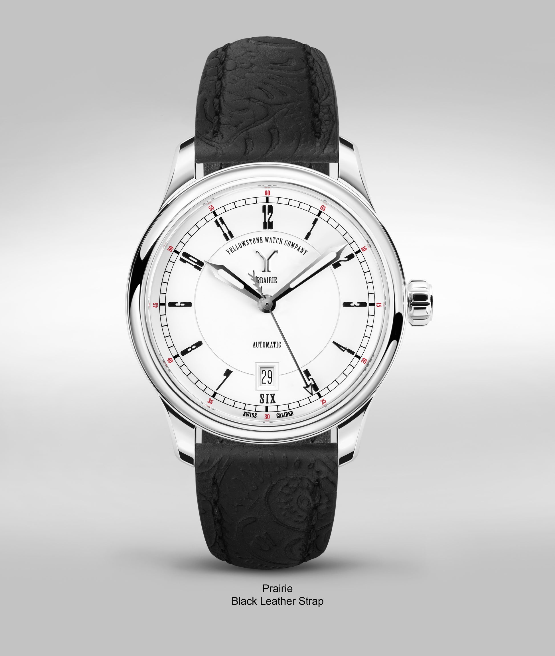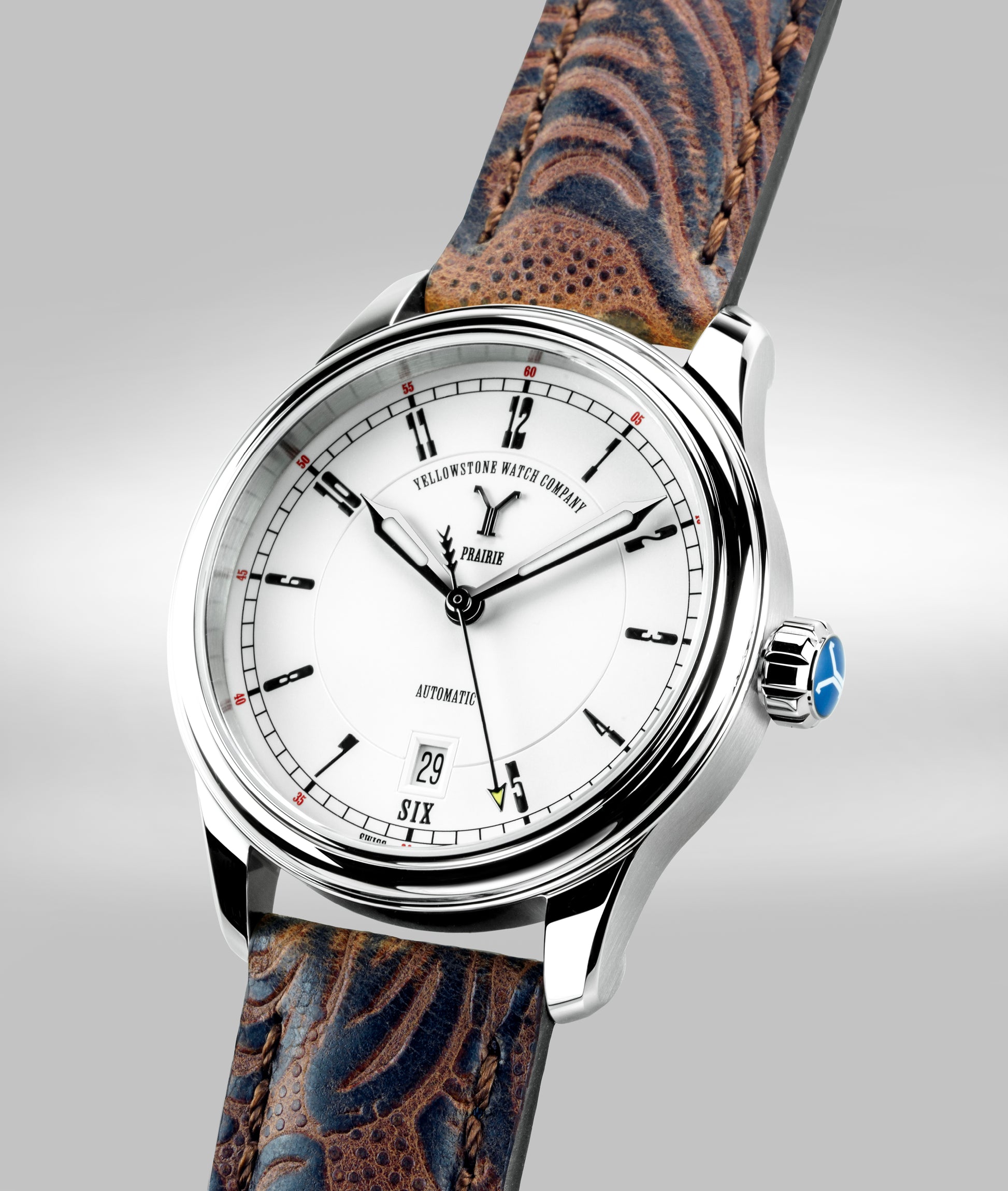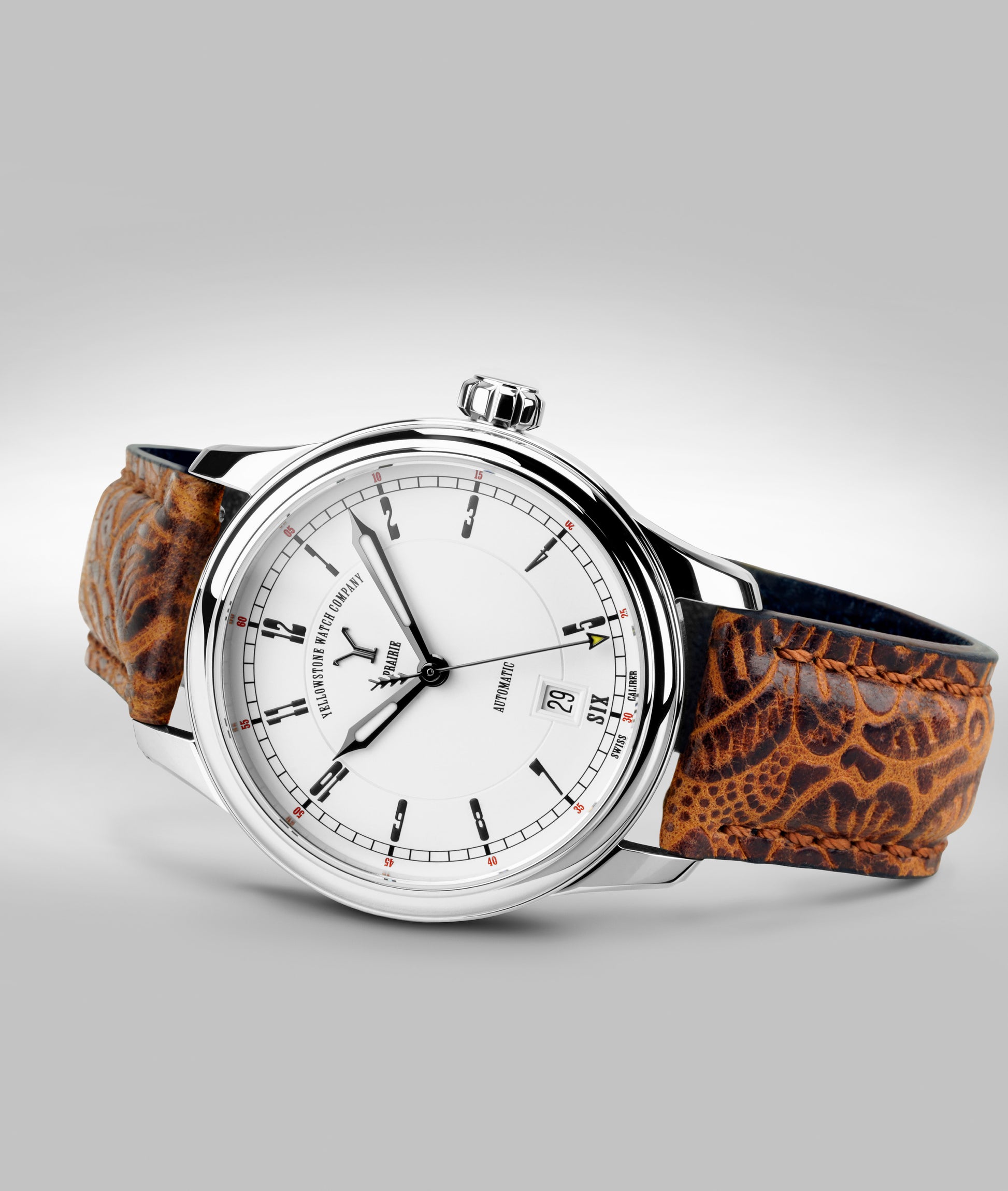 Strap: Custom western embossed leather with buckle and quick release spring bar