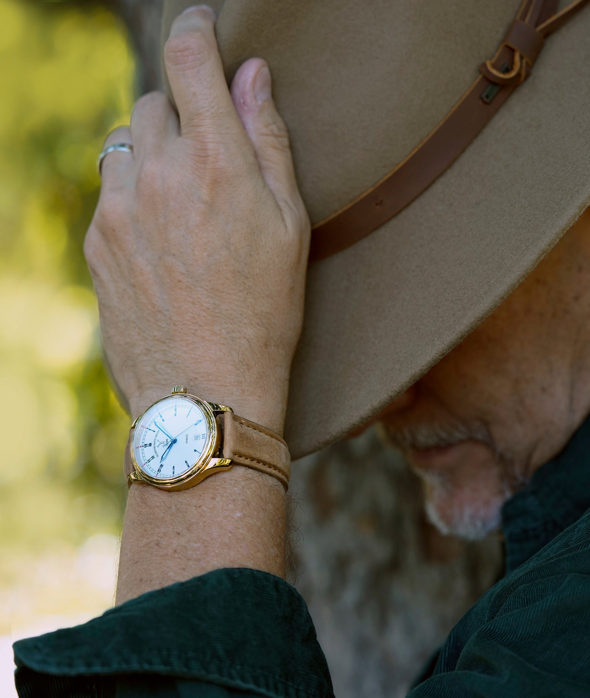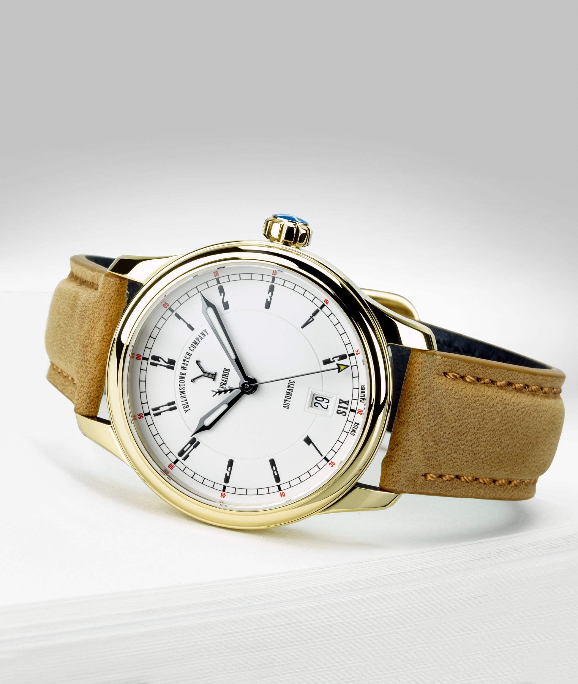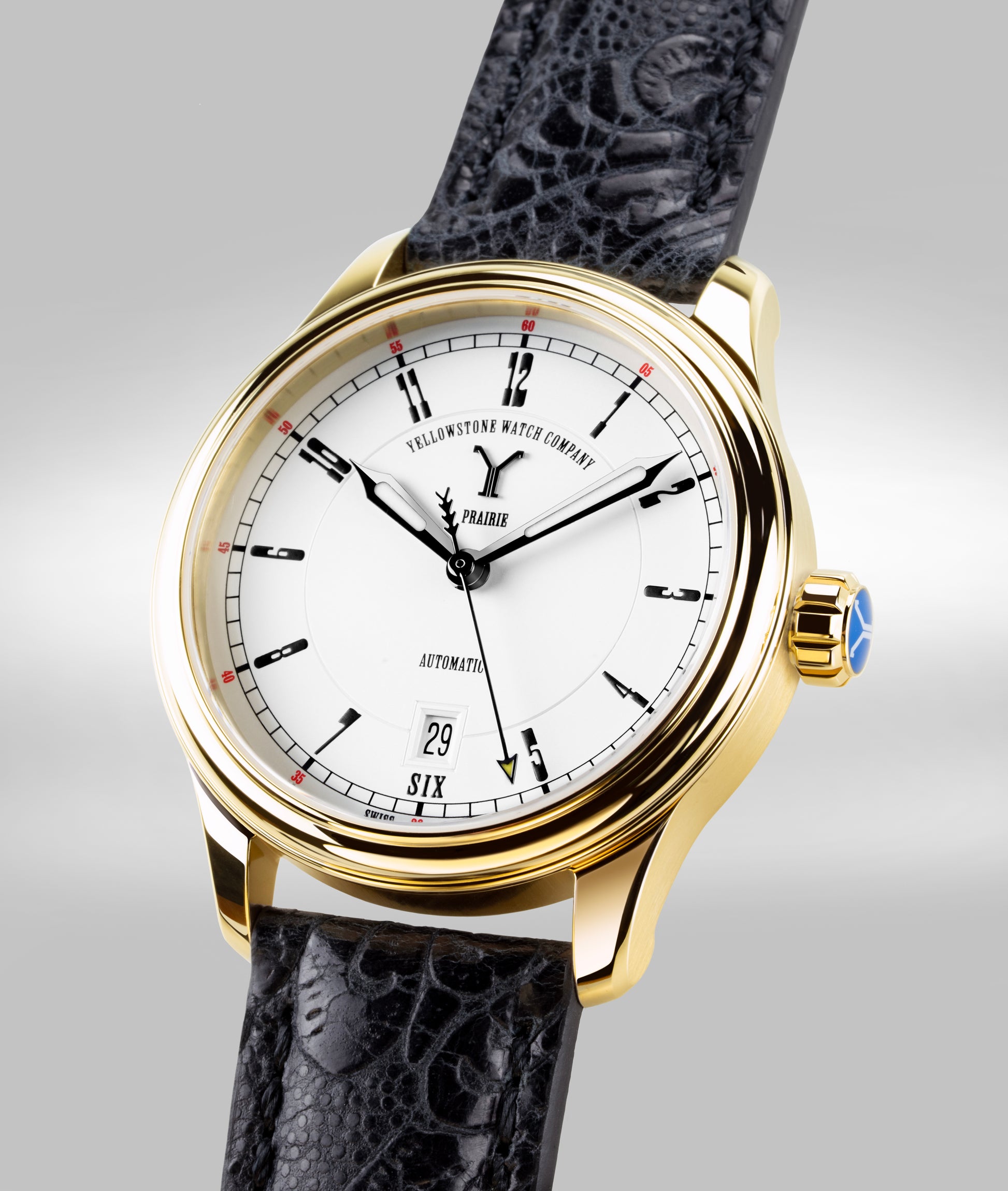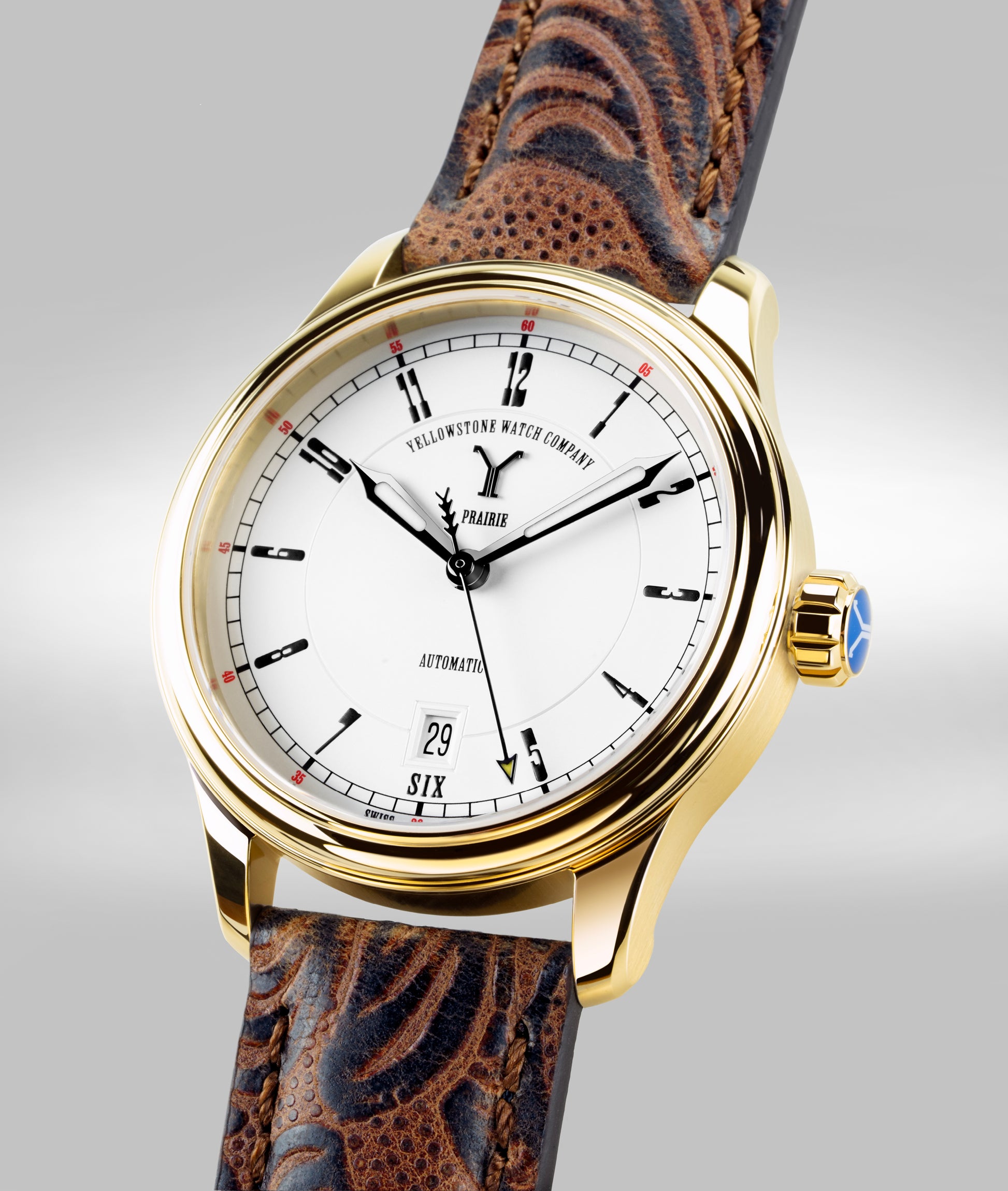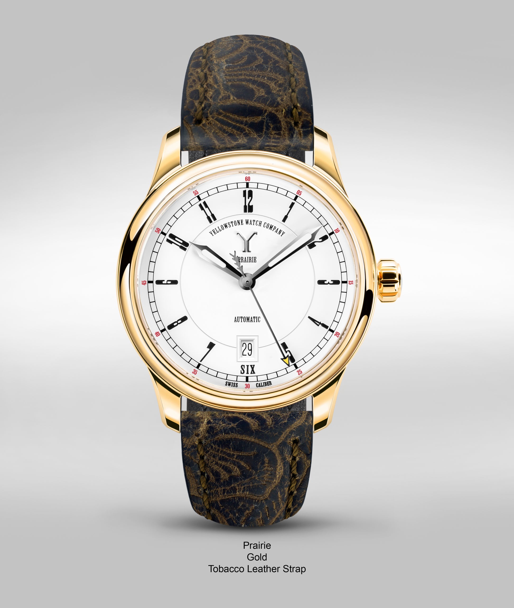The Prairie Edition introduced by Yellowstone Watch Company is in the spirit of a wagon wheel design that is reminiscent of the covered prairie wagons pioneers used to traverse the vast prairies of the American West.